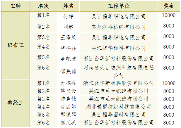 (1)織布和整經(jīng)第1-6名授予“全國(guó)紡織行業(yè)技術(shù)能手”榮譽(yù)稱(chēng)號(hào),具體名單如下: