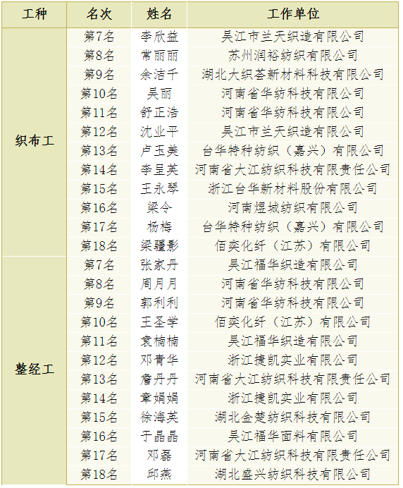 (2)織布和整經(jīng)第7-18名授予“全國(guó)長(zhǎng)絲織造行業(yè)技術(shù)能手”榮譽(yù)稱(chēng)號(hào),具體名單如下: