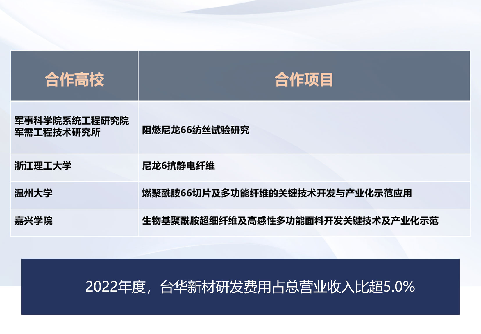 ?公司堅持走“產學研”合作的道路,公司“產學研”合作優勢突出,與東華大學、浙江理工大學、長三角 (嘉興)納米科技產業發展研究院(國家納米科學中心嘉興分院)、嘉興大學等專業院校、研究所合作, 組成優勢互補、產學研相結合的攻關隊伍,形成信息共享、基礎研究、技術攻關、技術推廣、 產業化應用互相聯動的研發格局,共同承擔了多個項目。與東華大學、浙江理工大學、嘉興大學等形成長期性產學研合作。與美國杜邦、德國德司達、美國亨斯曼、德國巴斯夫、日本TMT、津田駒、日本大金、德國 巴馬格、德國門福士、美國3M等業內的專家進行技術交流,開發高新技術產品及國際流行產品。